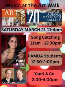 There will be LOTS happening Saturday March 21st all over Penticton. Here’s what’s happening at stop #20. POP UP Song Catching 11am – 12:30pm Support PAMDA students getting up and shining their light 12:30pm – 2pm Dance along to Yanti & Co. playing originals and fun covers 2-4pm