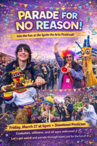 We’ll be walking down and up Main Street from the Elk’s Lodge to Gyro Park and back where we will start the festivities for the whole weekend of Ignite the Arts!