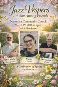 Don Wade’s Sax Among Friends will be playing Jazz Vespers at the Naramata Community Church March 19th 7pm. Tickets at the door by donation.