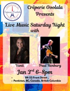 Crêperie Ooolala is Open Saturday Night with a new dinner menu. Come and see Paul Henbury and Yanti play and sing the night away. All are welcome, donations appreciated.